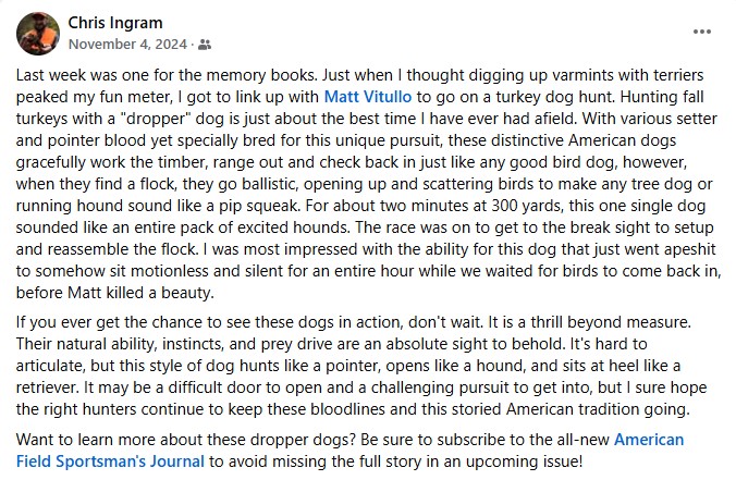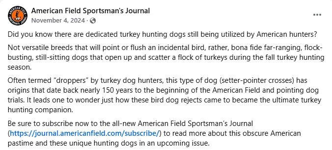 those who pursue wild turkeys with a dog. Our original