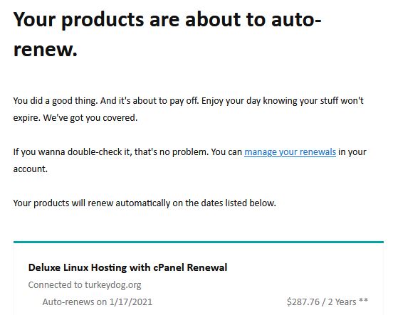 register turkeydog.org $287.76 GoDaddy 1/17/2023 Hosting 2 Yr Renewal $241.30 GoDaddy 3/19/23 Maximum Linux Hosting with cPanel (AutoSSL) $479 GoDaddy 3/23/23 Managed SSL for 2 years. That makes $1008.06 in 2023 alone. The cost to operate TurkeyDog.Org through GoDaddy is $597.02/year (as of August 2025). Most were renewed for 2 or 3 years. Here's the annual cost and when they're due: $155.88 Website Security Standard (January 10) $167.88 Web Hosting Deluxe (January 17) $38.28 Microsoft 365 Email Essentials Basic (January 26) $22.99 TurkeyDog.Org domain (June 6) $199.99 Managed SSL (June 10) $12.00 Full domain Protection (August 7). Loads faster now too. --------------------------------- $597.02 Total per year. I'm ready to pass the torch. If you have a vision of what Turkey Dog's future should be, contact me Jon 920-776-1272 awthda@turkeydog.org |