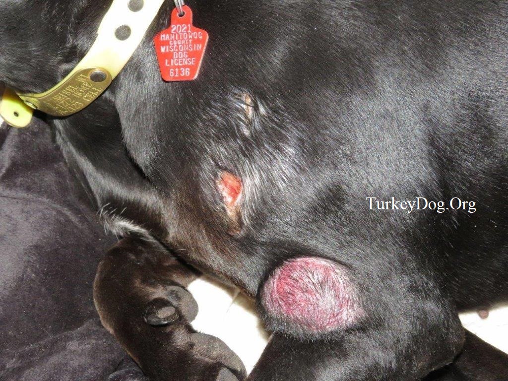 with a forceps. If he got it all, should heal up now.1/22/21 Her wound is still weeping. Been applying epsom salt hot packs many times a day and the horse linament once a day for an hour (with E.Collar). I looked inside the hole with a flashlight, but never see anything. Vet applied lidocaine to freeze it, then explored with forceps, couldn't find anything. Applied penicillin inside wound. It doesn't look any worse than it was. Antibiotics for another 5 days. 1/29/21 It healed shut. A lot of missing skin and hair. It's been 31 days. 10/13/21 here's why