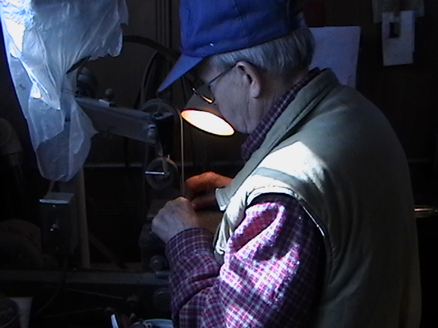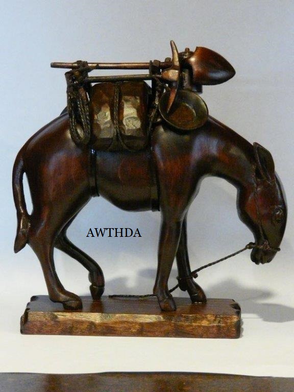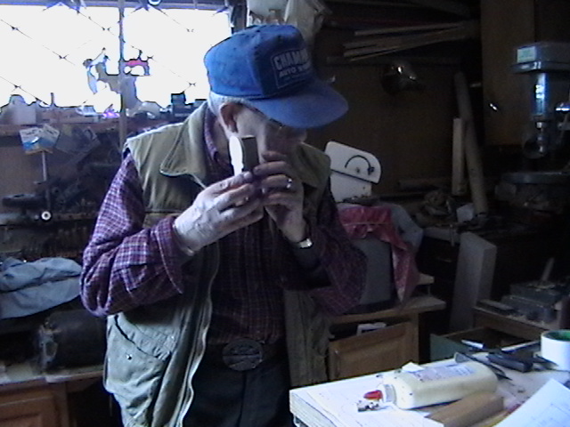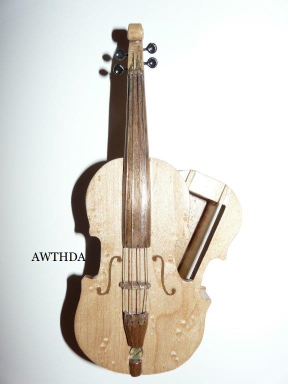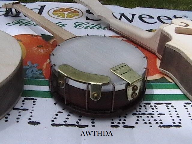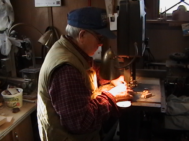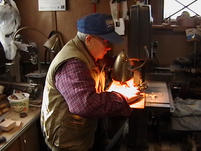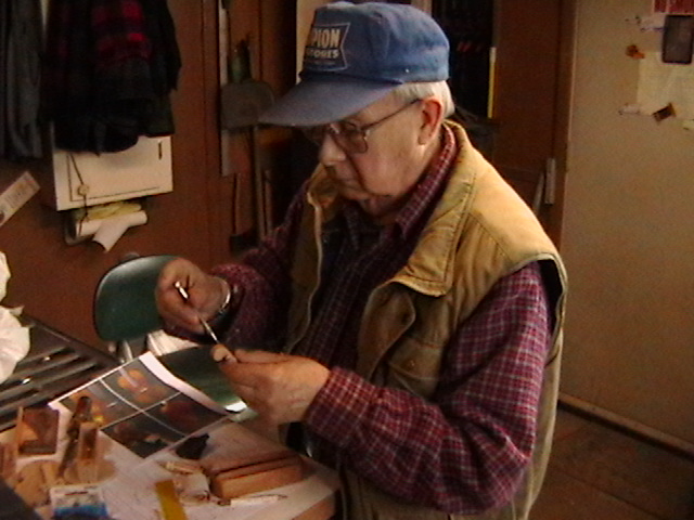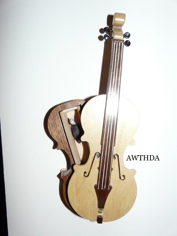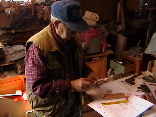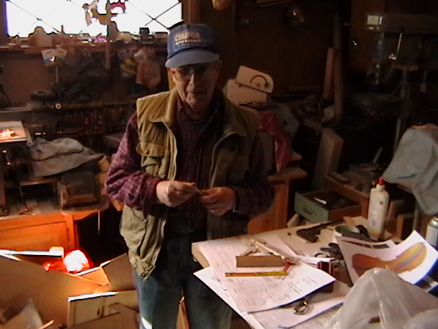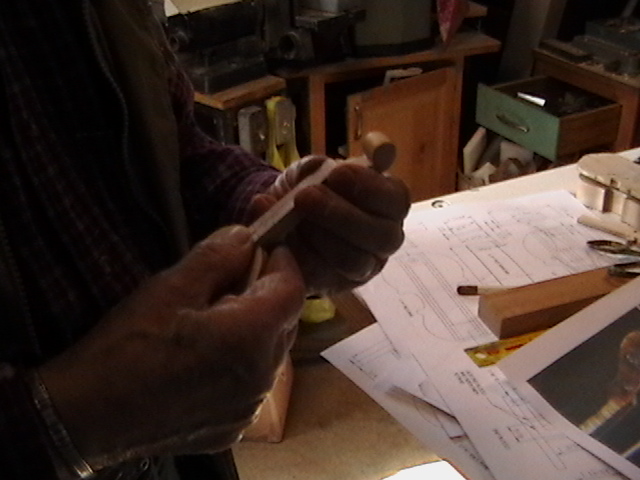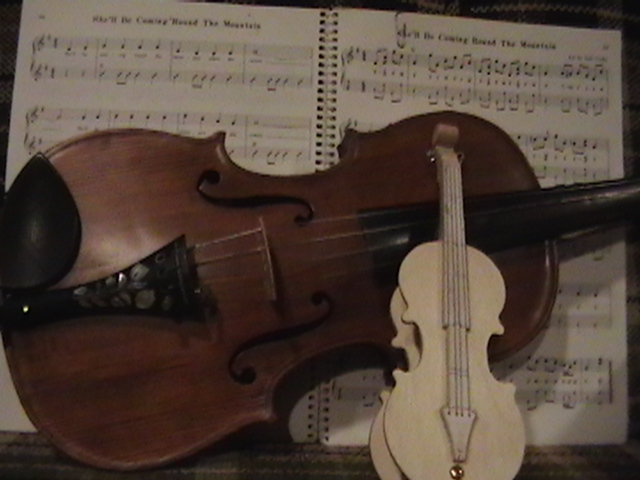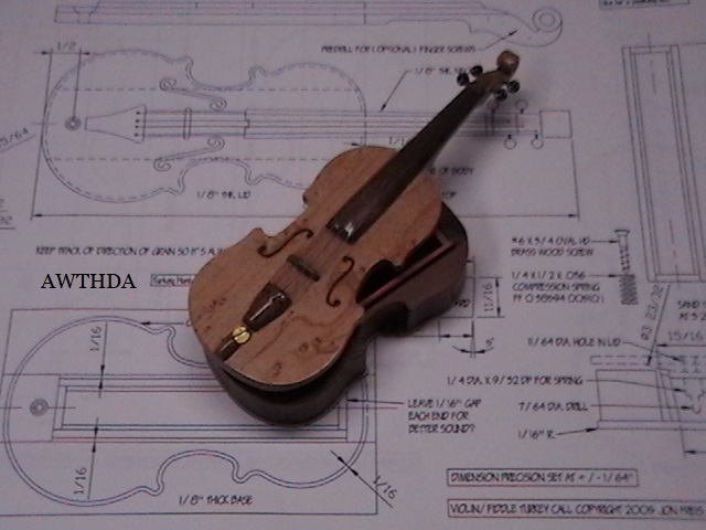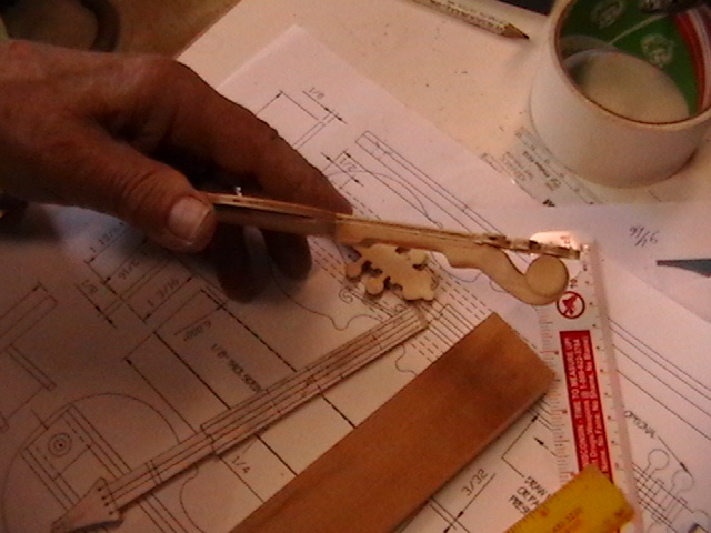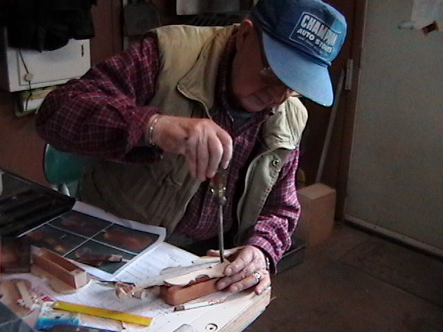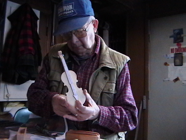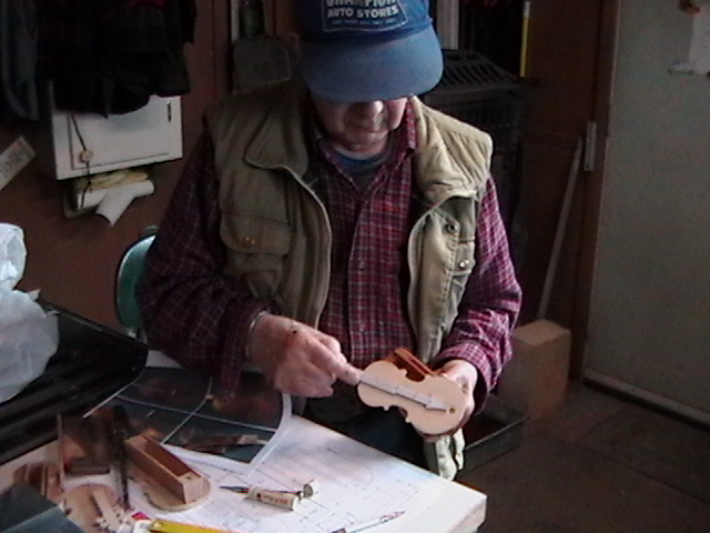 I showed my dear friend Bob, the number one gifted artist, talented musician, master craftsman and Chief model maker I ever knew (who freely shared his knowledge, always willing to help others) the first scale drawing of the fiddle. Bob let me take these rare pictures of him making the first fiddle, for posterity. When I saw him 5 weeks later, he had made 9 calls! Bob made all but the fiddles without any drawings! You know how easy it is to cut the shape out on a scroll saw, by gluing the drawing onto the wood? Well, Bob made these perfectly scaled models from his full size instruments, without drawings: 3 banjos (5-String, Tenor and Resonator), 1 guitar, 2 types of mandolins. Plus the 3 fiddles (and a few others). Among the many thousands of pieces Bob made for people to enjoy, this Hillbilly Banjo Picker and Gold Miner's Mule are in my collection. Bob made the first mule in 1976. It's got packs lashed onto the crossbucks, a shovel, pick, frying pan, coffee pot, gold miners pan, extra rope, hobbled with the halter rope tied to it's front leg. One ear back to the side, as if the mule is all done in, tired after hauling them heavy packs of gold. Bob's grasp of movement and sense of proportion is enjoyed by everybody that sees his work. For 33 years I asked Bob to make another one. In 2009 he did. Been treasured by me ever since. These are