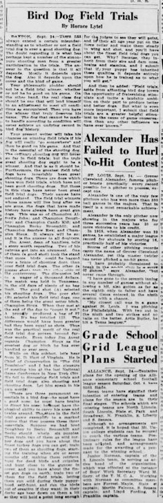 Bird Dog Field Trials By Horace Lytel for the Canton, OH Daily News 9/25/1927 DAYTON, Sept. 24. -- There has always existed a certain understanding as to whether or not a field trial dog is ever a good shooting dog. The doubt regarding it is what has perhaps kept a number of the simon-pure shooting men from a greater participation in the trials. The answer to the question is that it all depends. Mostly it depends upon the dog. Also it depends upon the cover and the kind of game. Your phlegmatic plodder should not be a field trial winner, whether or not he be good at his game. On the other hand, the real class dog should be one that will lend himself to an adjustment to meet all conditions as encountered. Then you have the winner that truly deserves his name. The dog that can not be made to handle according to conditions will never achieve an undying record in bird dog history. Your present writer will take his chances on winning field trials if his dog will really “go somewhere” and then be good on his game. And that is the essential of the shooting dog. The ordinary shooting dog will never go far in field trials; but the truly great shooting dog ought to be a winner. And that is at it should be. Furthermore, the greatest field trial dogs have invariably been great shooting dogs. There are dogs which have won field trials, which have not been good shooting dogs. But those in this class have never been great field trial dogs. Their names have not endured. The field trial winners whose names will live long after we are gone, the dogs that have made history have always been great gun dogs. This was so of Champion Alford's John; and Champion Doughboy; and Champion Candy Kid; and Champion Becky Broomhill; and Champion Seaview Rex; and Champion Sioux. It will always be so; and it is the answer to all doubters. Jim Avent, dean of handlers, tells a story worth repeating. Two of his patrons got into an argument. One of them (a good shot) took the stand that more birds could be bagged over a brace of shooting dogs, than over field trial dogs. The other (a poorer shot) took the other side of the controversy. The discussion led to a wager of a thousand dollars. The match was held in Tennessee, in the old days of plenty of no bag limit. The good shot (A) selected his shooting dogs. The poor shot (B) selected his field trial dogs, one of them being the great setter bitch, Champion Sioux. When they met at the end of the day to While on this subject, let's hear from M. D. Hart of Virginia. He is Chief of Conservation in “The Old Dominion” and I had the pleasure of meeting him at the last National Game Conference in New York City. We fell to discussing field trials and field trial dogs; also shooting and shooting dogs. Let him speak in his own words: “There are three paramount essentials in a bird dog - he must have a good nose; he must have brains to direct his nose; he must have the physical ability to carry his nose and brains around. The stars in the field trial game exemplify to a marked degree that they possess these three essentials. Suppose we had bred Doughboy to Becky Broomhill and Becky should whelp six puppies. Then train two of them as wild turkey dogs and you have about the finest turkey dogs you can get; train two of them as shooting dogs, starting the training when six or seven months old, making them retrieve, hunt for dead birds and cripples and hunt close to the gunner in cover and you have about the finest gun dogs on earth; train two of them for the field trials, letting them run wild during their puppy-hood, self-hunt and run the birds out of creation if they want; in their derby age (6 months of age and no more than 2 years of age) bear down on them a bit so they will hold a point long enough for the judges to see they will point, and in their all age year put on the force collar and make them steady to wing and shot, and you'll have about the finest field trial dogs you can get. Why? Because they inherit from their sire and dam nose, brains and stamina, and I submit that if your puppy has inherited these qualities it depends entirely upon how he is trained as to what you will get.” And then he added: “Field trials, aside from affording bird dog lovers the opportunity of fraternizing, stimulate and incite a laudable ambition on their part to produce better dogs. But what is even more important, I submit that field trials are a greater helpful stimulant to the cause of game conservation than any other influence we have ever known.” ---
