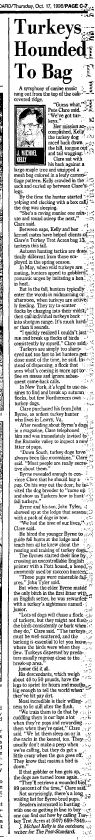 ![]() "You know our fathers had plenty of deer and skins, our plains were full of deer, also our woods, and of turkies, and our coves full of fish and fowl," the tribe's sachem, Miantonomi, told the Montauk of Long Island. "But these English have gotten our land, they with scythes cut down the grass, and with axes fell the trees; their cows and horses eat the grass, and their hogs spoil our clam banks, and we shall be starved." Page 72 America's Hidden History By the early 1700's, game in the Piedmont region became scarce. By 1750, the virgin Appalachians as far west as Kentucky would be hunted out. The nice article on the left is about Pete Clare, his dog Kelly, John and John Tyler Byrnes in the October 17, 1996 Syracuse Post Standard. I can send a pdf that's easier to read - request a bigger copy. |