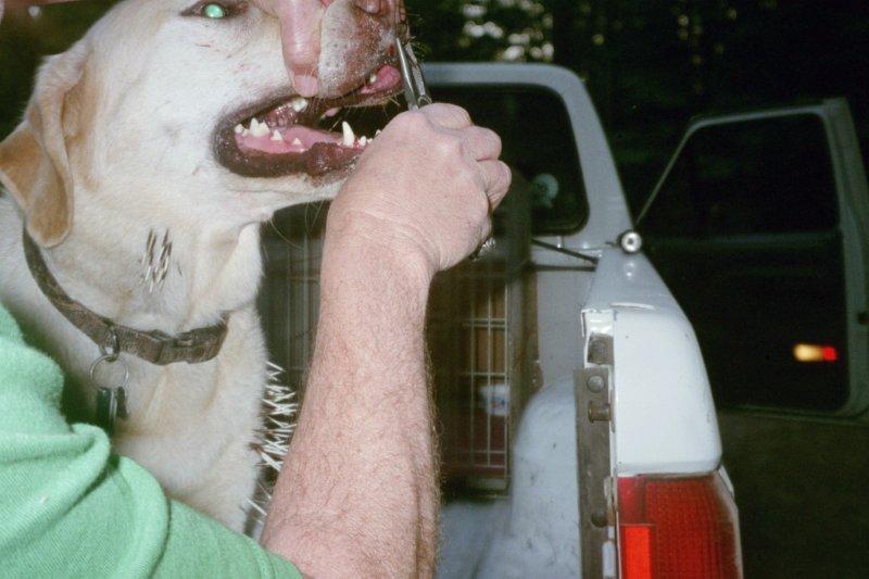 Barns 2/21/10 Loysville, PA 717-789-4295 "Yes, I did clip the quills with the pliers before pulling most of them out of Tucker. Took about two hours to get them all out. Would of taken him to the Vet but we were in the northern part of the state at camp and the closest Vet was at least an hour away. Took a few quills out right after it happened (photos above) but the mosquitoes were like vultures with the fresh blood. Went back to camp and had my girlfriend basically sit on Tucker to hold him still. He didn't like the pliers rattling off his teeth. But once he figured out that we were trying to help him, he just laid there until I got them all. Some were 3" long and some were 1/2" long. Luckily, none became infected and everything turned out OK. Tucker