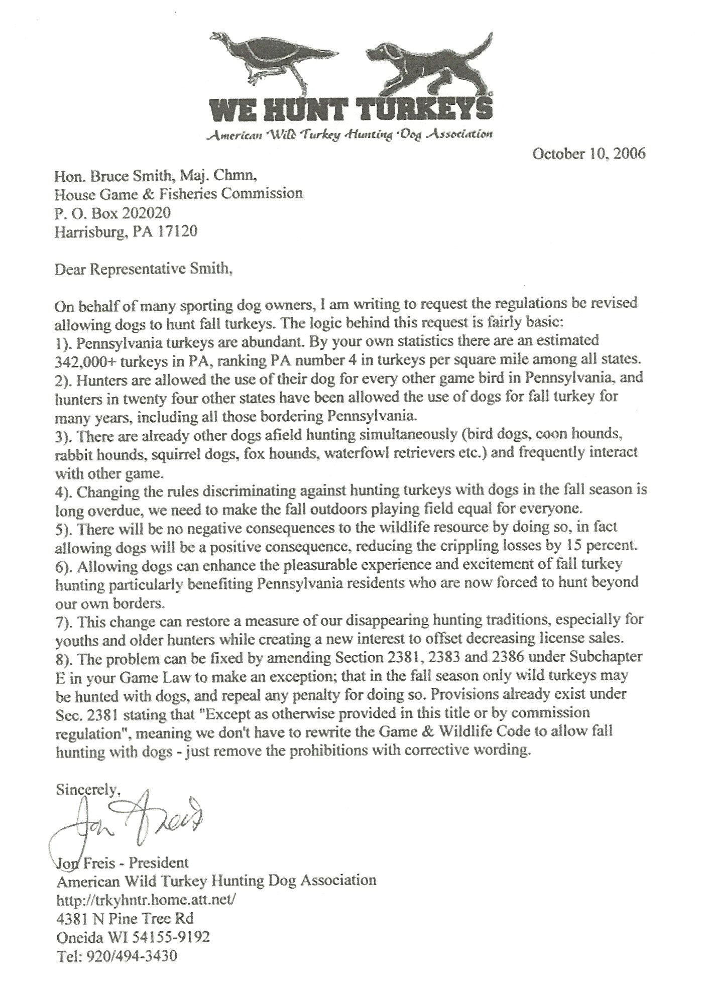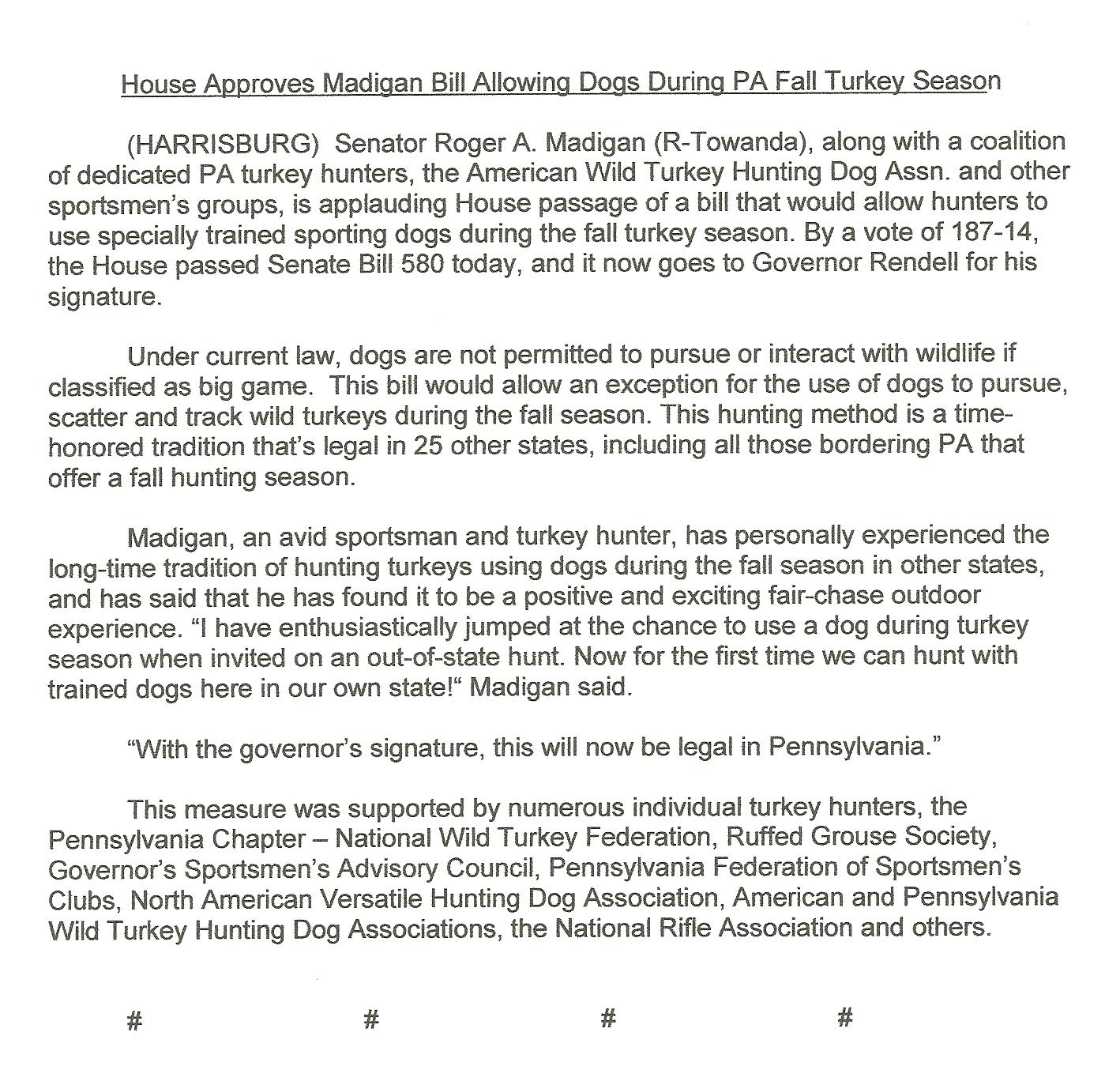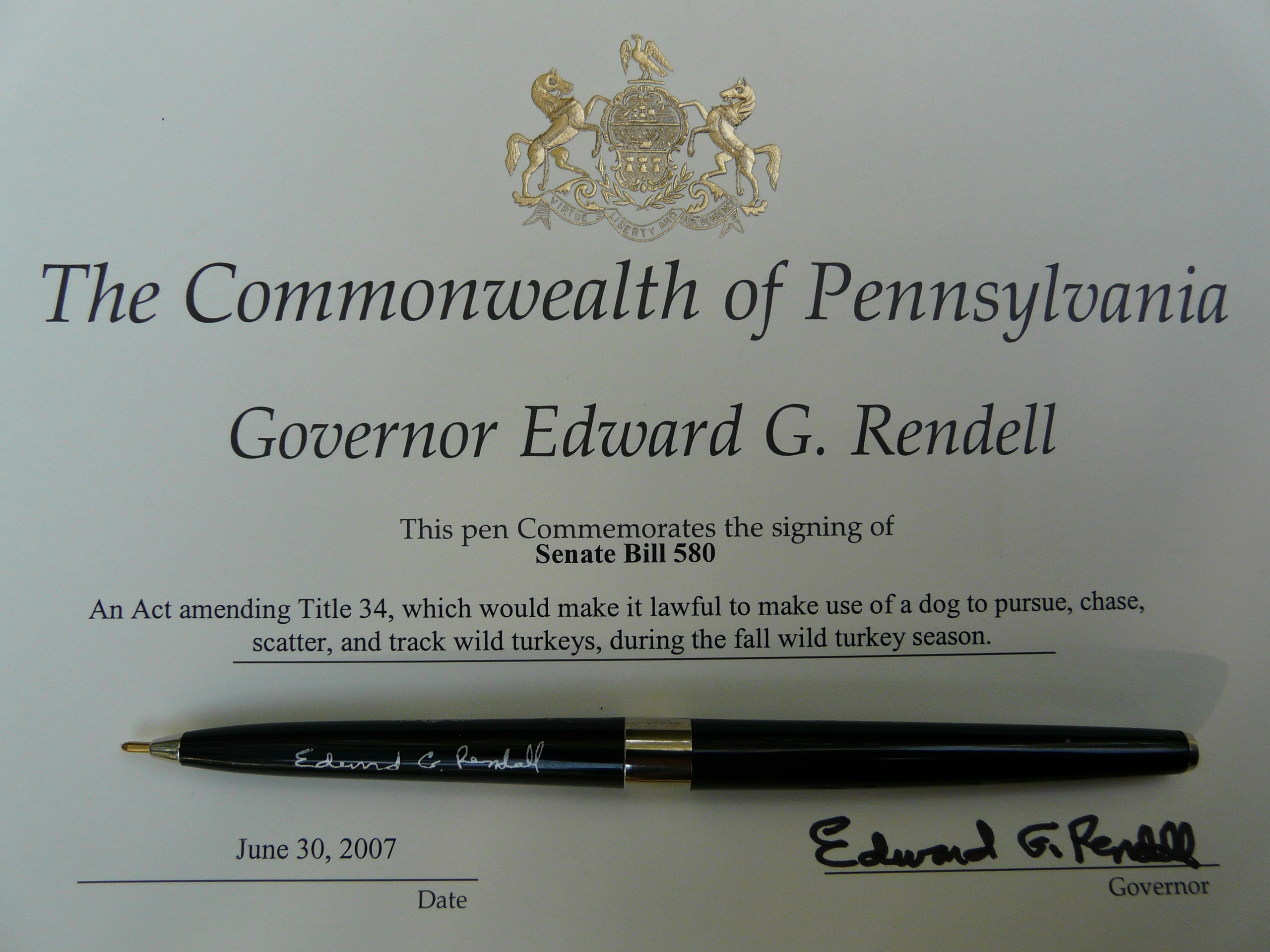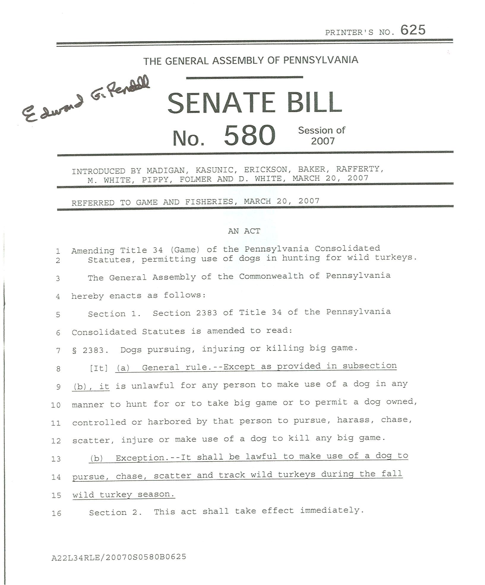 ![]() House Bill 1675 is "related" to the use of dogs for hunting. If enacted, this would amend Title 34(Game) of the Pennsylvania Consolidated Statutes. House Bill 1675, providing for dogs pursuing game or wildlife, is currently in the House Game and Fisheries committee. One concern that lingers around any legislation dealing with the use of dogs for hunting purposes is that many people believe it would commercialize the use of dogs and their handlers. As far as turkey dogs are concerned, many people may be inclined to avoid such legislation for fear of commercializing the use of dogs. (this was one of the many false starts with the legislature)." Merle H. Phillips, Rep. Pennsylvania 108th District |